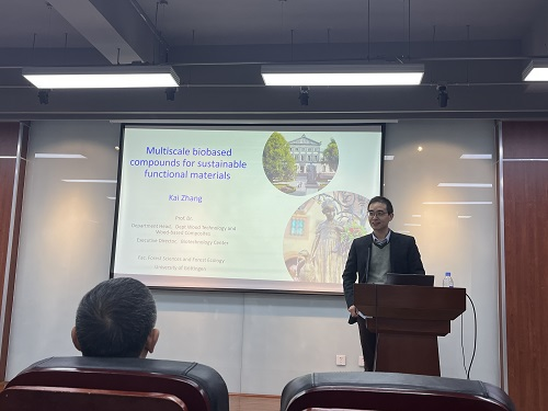 2023年4月24日,应太阳成集团tyc33455cc邀请,德国哥廷根大学森林科学与森林生态学公司生物技术中心执行主任、木材技术与木基复合材料系主任张凯教授在皮革楼215报告厅为全院师生作了题为“可持续功能材料的多尺度生物基化合物”的学术报告。报告会由太阳成集团tyc33455cc副经理陈意教授主持。陈意副经理首先介绍了张凯教授的简历和学术成就,然后代表公司向张凯教授致以诚挚的欢迎。公司石碧院士、陈意教授与青年教师以及本科生和研究生参加了报告会。