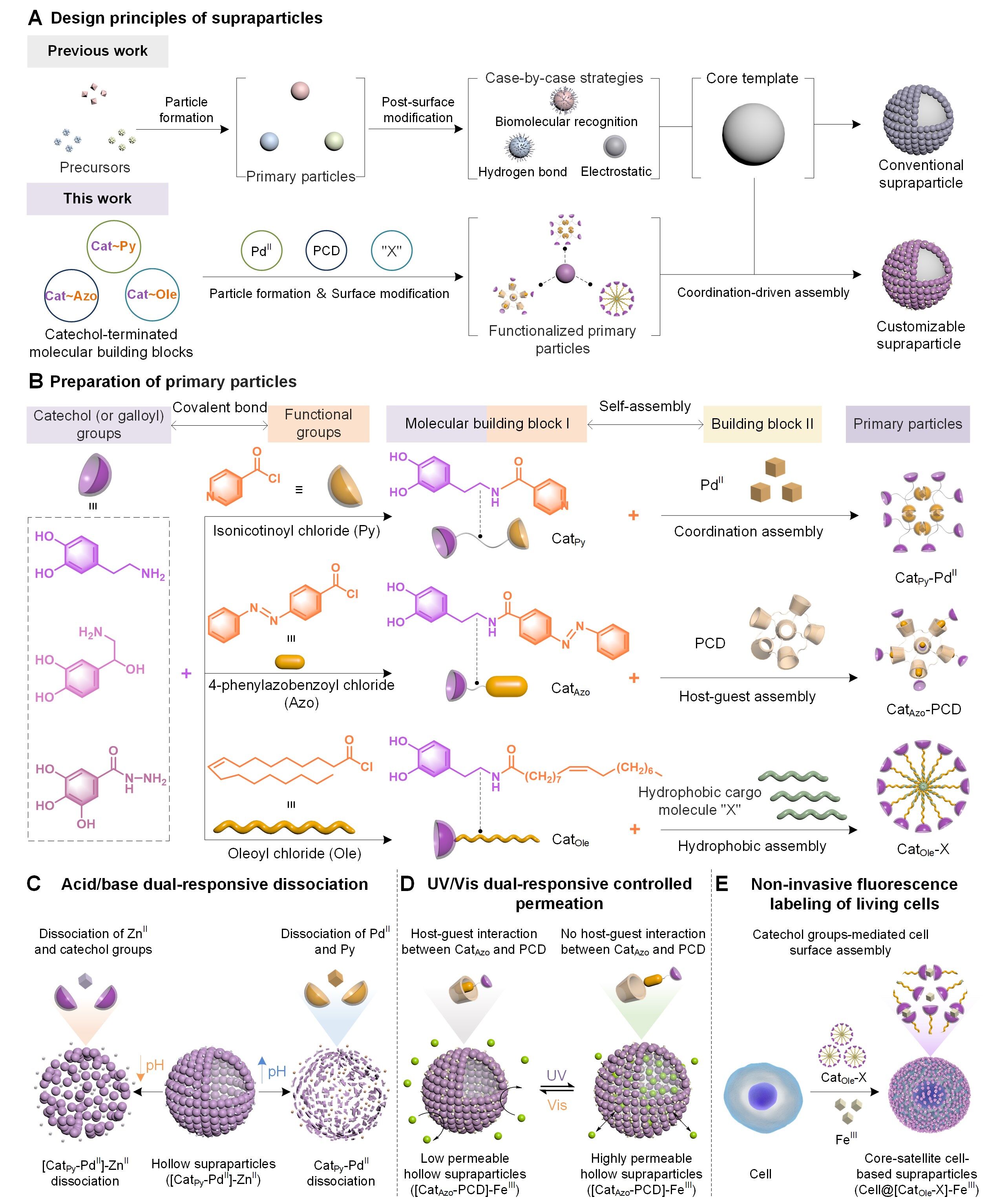 该团队首先将邻苯二酚基团与多种功能基团偶联,包括异烟碱酰氯(Py)、4-苯基偶氮苯甲酰氯(Azo),油酰氯(Ole),形成以邻苯二酚为末端的母体分子单元。该母体分子可以通过多种分子间相互作用(即金属络合、主客体相互作用和疏水相互作用)获得初级纳米颗粒(图1B)。这些初级纳米颗粒包含丰富的邻苯二酚基团,因此可以进一步通过多酚与金属络合作用实现二级超结构颗粒构建。该团队证明了,通过将不同的功能基团与邻苯二酚基团结合,可以获得具有一系列功能的超结构颗粒,如酸碱双pH响应性(图1C)、光控渗透性(图1D)和膜非损伤的细胞标记(图1E)。该研究为构建具有可定制化功能和多层级结构的超级颗粒系统提供了新的策略和研究思路。该文通讯作者为郭俊凌教授和龚贵东副研究员(专职科研),第一作者为轻工公司2021级博士研究生张亚静、材料公司本科生王瑾(现芝加哥大学博士研究生)和轻工公司何云翔副研究员(专职科研)。国际著名超分子学家Ian Manners教授也对该研究提出了宝贵的建议。