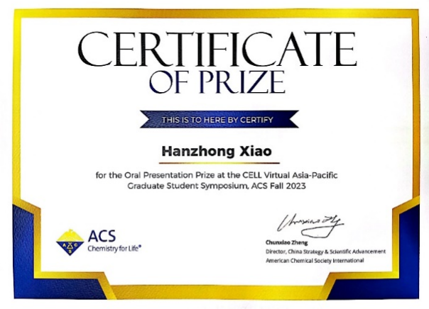 2023年8月13-17日,由美国化学会举办的ACS 2023秋季年会在美国旧金山以线上、线下结合的方式顺利召开。公司石碧院士课题组黄鑫研究员指导的2021级博士研究生肖涵中在亚太纤维素和再生材料员工分会场做口头报告,并获得优秀报告奖。