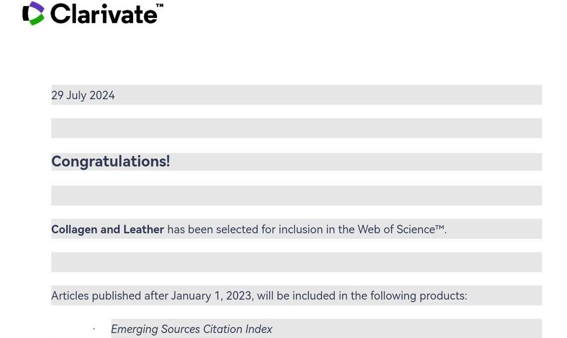 此次收录标志着国际学术界和出版界对Collagen and Leather期刊质量和发展潜力的进一步认可,对提升期刊的学术传播力和国际影响力具有重要意义。