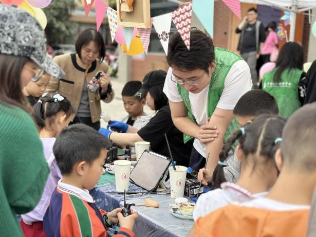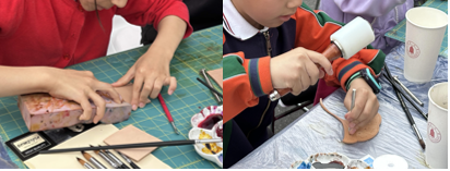 活动现场,团队成员以皮雕与皮革染色作品为媒介,向小朋友们生动普及了植鞣牛皮的材料知识,详细讲解了传统植鞣工艺、皮革特性以及塑形与染色原理,展现了皮雕作为国家级非物质文化遗产技艺的独特魅力。随后,团队进行了皮雕与染色技艺的现场演示,引导小朋友们亲手参与体验,激发了他们对传统工艺与现代设计融合的浓厚兴趣。