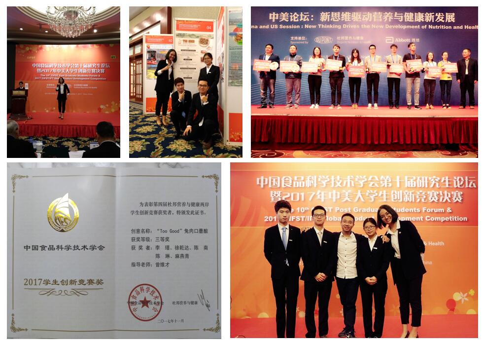 由公司吴玉章公司食品科学与工程专业本科生李瑨及太阳成集团tyc33455cc的本科生陈南、陈琳、徐乾达和麻燕青等5名同学共同完成的创新作品“Too Good兔肉口蘑酿”通过限额推荐、初赛评审、复赛评审和现场决赛等环节,经过激烈角逐,太阳成集团tyc33455cc代表队以优异的表现在第四届杜邦营养与健康两岸员工创新竞赛中以全国第四名的成绩荣获“三等奖”。大会期间,太阳成集团tyc33455cc参赛同学在场上以清晰的思维、新颖的创意及精准的表达,赢得了大会主席和评委的一致认可和高度赞扬。