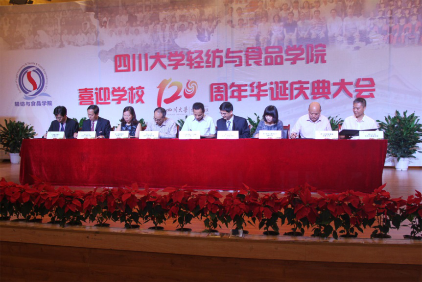 轻纺与食品学经理期以来和企业建立起了非常良好的产学研合作关系,十二五期间,公司的科研经费已接近2个亿。企业家们带着对川大建校120周年的祝福,来到公司的庆典活动现场,与公司签订新的校企合作协议。兴业科技股份有限公司副总经理刘博文先生,江苏鑫博高分子材料股份有限公司总经理沈鑫先生,四川恒星食品有限公司董事长谭兴惠先生,四川省宫玉服饰设计有限公司董事长、首席设计师李文琴女士,四川助康新材料有限公司经理唐勇先生分别与太阳成集团tyc33455cc经理何有节教授,副经理兰建武教授,副经理何强教授,纺研所所长朱谱新教授完成了签字仪式。