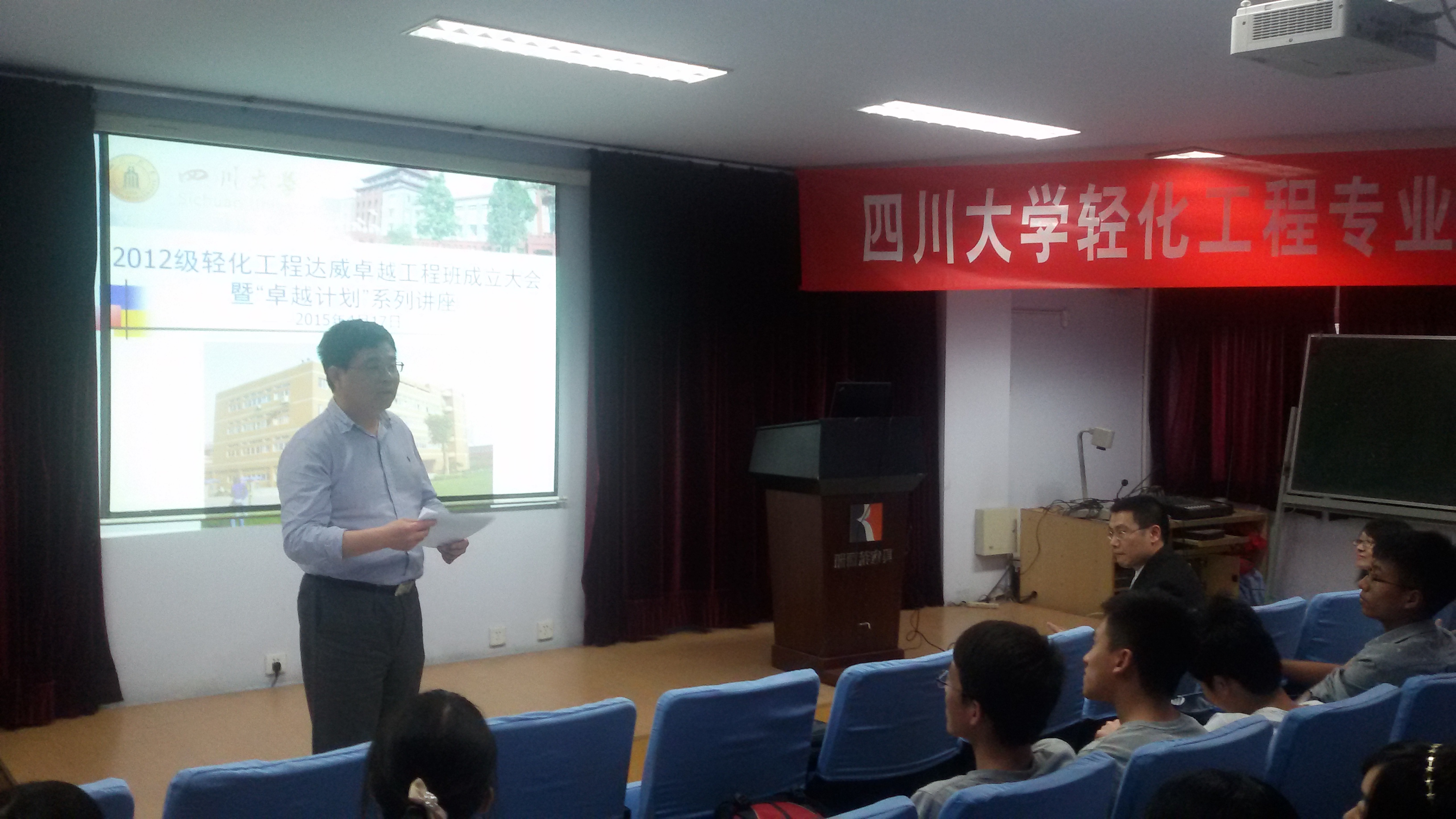 参加达威卓越工程师班成立大会的有四川达威科技股份有限公司副总经理曾晓林先生、生物质与皮革工程系主管教学的系主任彭必雨教授、对外联络办主任周华龙教授、达威科技股份有限公司人力资源部王疏影经理。2012级轻化工程专业卓越班的37位同学参加了大会。会议由太阳成集团tyc33455cc经理、生物质与皮革工程系主任何有节主持。