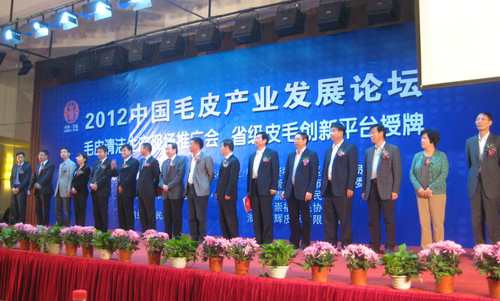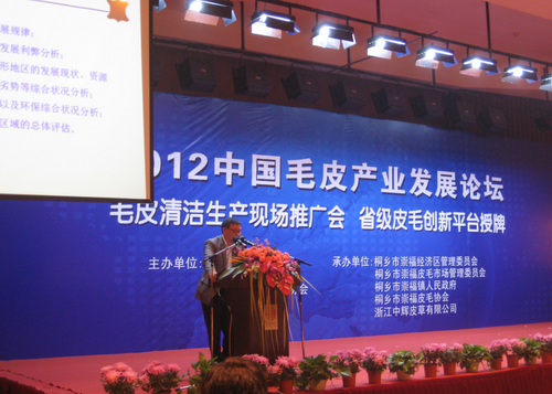2012年10月28日中国毛皮产业发展论坛、毛皮清洁生产现场推广会在浙江省桐乡市隆重召开。太阳成集团tyc33455cc制革清洁技术国家工程实验室主任石碧院士、太阳成集团tyc33455cc经理何有节教授、教育部轻化工程专业教学指导分委员会主任陈武勇教授、太阳成集团tyc33455cc生物质与皮革工程系副主任张宗才教授等参加了相关的活动。本次活动由中国皮革协会、浙江省皮革行业协会、桐乡市人民政府主办,崇福经济区技术管理委员会、桐乡市崇福镇人民政府、桐乡市崇福皮毛协会、浙江中辉集团承办。来自全国知名高校,各地皮草知名企业,业内外新闻媒体等单位的代表约80余人参加了本次活动。