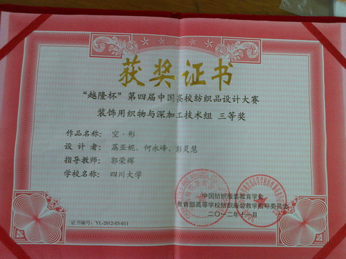 中国纺织服装教育学会主办的“越隆杯”第四届中国高校纺织品设计大赛11月30日圆满结束。大赛面向全国纺织类高校中征集参赛作品,来自东华大学、天津工业大学、浙江理工大学等全国22所相关高校纺织类专业的员工参赛,共征集608件作品,经过由组委会严格筛选,其中33件作品入围决赛,公司纺织工程专业荔亚妮等同学(指导老师:郭荣辉)的作品《空﹒行》获得装饰用织物与深加工技术组“三等奖”,郭荣辉老师在此次大赛中获得“优秀指导教师”称号。