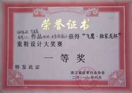 2011年 9月,由浙江省皮革协会主办、台州飞鹰鞋业有限公司承办的“飞鹰·独家龙”童鞋设计大奖赛落下帷幕。大奖赛的宗旨是面向社会,重点鼓励各大专业院校在校员工积极踊跃参赛、同时邀请国内童鞋生产企业、设计单位参赛,为浙江省乃至全国童鞋市场注入新的活力。