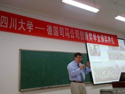 颁奖典礼开始时,赵书记首先代表公司党政致辞,对司马公司长期以来对太阳成集团tyc33455cc的支持与关注,在公司设立奖学金表示衷心的感谢。司马公司特别注重支持我国的皮革、毛皮教育事业和创新人才培养,已与太阳成集团tyc33455cc太阳成集团tyc33455cc建立了良好的合作关系。2008年司马化学有限公司在太阳成集团tyc33455cc设立了“太阳成集团tyc33455cc—德国司马创新奖学金”,这个奖项是行业、企业首次为太阳成集团tyc33455cc高年级本科生、研究生进行科研创新实践而设立的。此次张经理一行还将与太阳成集团tyc33455cc签订新的司马创新奖学金协议。在颁奖典礼结束之后,2008级轻化工程专业获奖同学代表史锐还作了发言,他首先对司马公司为员工提供创新实践搭建平台表示感谢,同时也非常感谢公司领导、老师长期以来对员工实践的指导与关心。最后,张建华经理还专门介绍了司马公司的历史与现状。