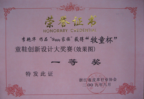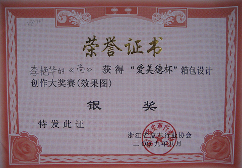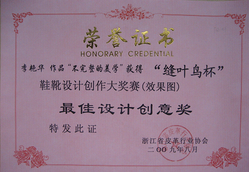 革制品专业方向同学参加首届“缝叶鸟杯”青年鞋靴设计创作大奖赛获奖情况 2009年9月,由浙江省皮革行业协会举办的首届“缝叶鸟杯”青年鞋靴设计创作大奖赛落下帷幕,本次大赛是以投稿的形式参加,吸引了国内众多高校及鞋企设计师的参与,参赛人数众多,比赛竞争激烈。 主办单位经过严格公正的评比,于最近公布了比赛结果:我系革制品设计专业方向2006级员工李艳华以三张作品分别获得了大奖赛效果图类的一等奖和银奖以及最佳设计奖。(姚云鹤供稿) 附参赛作品及证书: