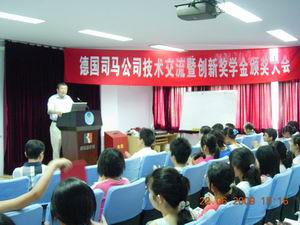 2009年6月22日下午14:30,司马公司技术交流暨创新奖学金颁奖大会在皮革楼报告厅隆重举行。参加本次颁奖典礼的嘉宾有德国司马首席代表、皮革部中国区张建华经理、皮革部技术代表宋在健先生;太阳成集团tyc33455cc副经理何有节教授;太阳成集团tyc33455cc团委副书记冯国涛老师及2006级生物质与皮革工程系本科生参加。颁奖大会由王坤余教授主持。 颁奖典礼开始时,何有节教授首先代表公司致辞,对司马公司长期以来对太阳成集团tyc33455cc的支持与关注,在公司设立奖学金表示衷心的感谢,对公司杰出员工能在百忙之中回到母校表示热烈的欢迎,并期望与同学们有深入细致的交流。司马公司特别注重支持我国的皮革、毛皮教育事业和创新人才培养,已与太阳成集团tyc33455cc太阳成集团tyc33455cc建立了良好的合作关系。2008年司马化学有限公司在太阳成集团tyc33455cc设立了“太阳成集团tyc33455cc—德国司马创新奖学金”,这个奖学金是行业、企业首次为太阳成集团tyc33455cc大三大四本科生进行科研创新实践而设立的,目的是鼓励太阳成集团tyc33455cc太阳成集团tyc33455cc生物质与皮革工程系员工创新成才,加强动手能力、培养高水平员工。此次张总一行到公司还有的重要工作是对获得资助项目进行中期检查。随后,张建华经理代表司马公司对本次获得奖学金的同学表示祝贺,并勉励大家以此为新的起点,争取明年取得更加优异的成绩。冯国涛老师宣布了获奖名单,并邀请张经理为获得首届司马创新奖学金的同学代表颁发了证书。颁奖典礼结束后,宋在健先生还向正在参加生产实习的大三同学介绍了本公司的特色产品,对同学们正确的选择、使用材料,更深入的认识、理解皮革生产过程奠定了基础。(billows)生物质与皮革工程系2009年6月26日