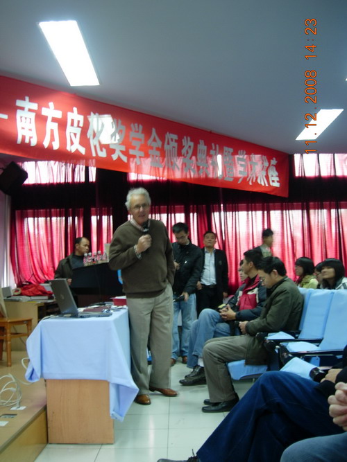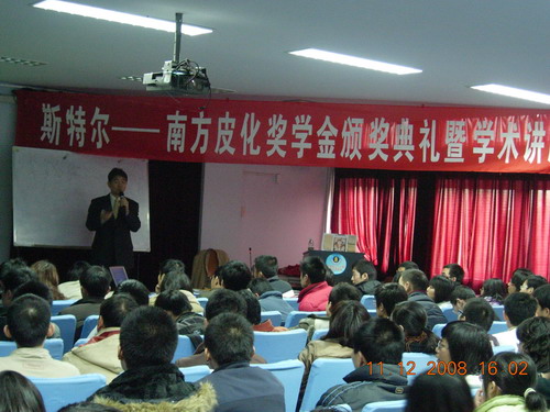 2008年12月11日下午14:00,斯特尔—南方皮化奖助学金颁奖典礼及学术讲座皮革楼二楼报告厅隆重举行。参加本次颁奖典礼的嘉宾有Stahl公司欧洲总部涂饰部门经理Peter教授;Stahl公司亚洲水场及染粉部技术经理李教授;Stahl公司华南区涂饰部销售经理谭子夜先生;Stahl公司涂饰部技术、98级皮革系员工涂刚先生;以及生物质与皮革工程系副系主任张宗才教授,王坤余教授。 颁奖典礼在一片欢呼声中举行,Peter教授首先致辞,表示了对获奖同学的祝贺,并希望他们再接再励,争取更加优异的成绩。接下来Stahl公司为我们进行了长达4小时的学术讲座,现场座无虚席,同学们踊跃提问,让讲座气愤相当热烈。讲座分为两个部分进行,首先是由Peter教授为同学们作喷涂方面的知识讲座,1个小时的讲解结束后,还带领同学们到资料室现场参加、亲自感受了由Stahl公司专门从欧洲带过来的100多张皮革样品,各种风格、不同种类的皮革样品让同学们眼花缭乱,也深深体会到了皮革喷涂的艺术性与高雅性。接下来由李教授为同学们做了水场方面的讲座,李教授深入浅出,讲解细致,让同学们对水场的操作有了全面的了解与更深的体会。讲座结束以后,Stahl公司还为参会同学赠送了精美的礼品。本次学术讲座的成功举办,相信让同学们大开眼界,对书本的理论知识有了更深的理解,也对皮革行业多了一份热忱与期待。2008年12月12日