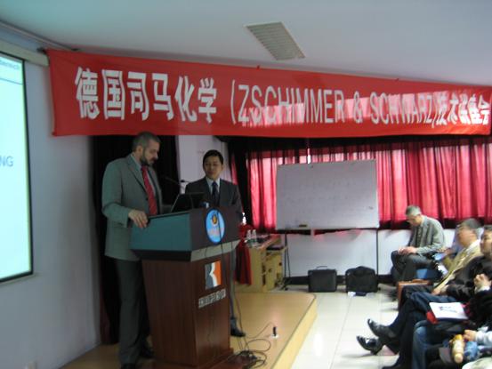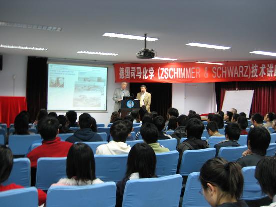 2008年3月27日-29日,德国司马化学(ZSCHIMMER & SCHMWARZ)有限公司应用部技术经理(Director of leather Application Dept.) Mr.Neumeier、研发部经理(Head of R & D Dept.Leather Division) Dr.Francke、司马首席代表、皮革部中国区张建华经理、皮革部技术代表宋在健先生、成都子航实业有限公司总经理周勤先生(司马在四川的代理商)、成都子航实业有限公司副总经理赵静女士等一行六人访问了太阳成集团tyc33455cc太阳成集团tyc33455cc皮革工程系,并于2008年3月29日上午在皮革工程系报告厅为本科生、研究生举行专场技术报告会。参加本次报告会的有太阳成集团tyc33455cc副经理何有节教授、04级辅导员刘健西老师以及轻化工程本科生、研究生共100余人。报告会由何有节教授主持。 Mr. Neumeier首先就德国司马化学有限公司的创立、发展及主要产品给大家作了详细的介绍。Dr.Francke 作了题为Introducing of ZSCHIMMER & SCHWARZ Fatliquoring Agents的报告,对该公司的加脂剂及其他产品的性能、应用做了详细的介绍,并展示了该公司生产的汽车坐垫革,引起了同学们的浓厚兴趣。报告会结束以后, Mr.Neumeier、Dr.Francke、张建华先生等就汽车坐垫革的制革工艺,制革工艺中的环保问题等同学们非常关心的问题进行了详细的交流,同学们提问积极踊跃,现场气氛十分活跃。 德国司马化学有限公司成立于1894年,总部位于德国莱恩斯坦市,公司一直致力于皮革化学品、毛皮化学品、陶瓷化学品、化纤化学品以及各种表面活性剂的开发研究,公司有超过三分之二的销售额来自国外业务。与此同时,公司有自己的一套完备的废水净化设备和技术,履行对环境保护的承诺。