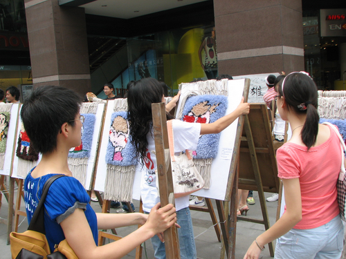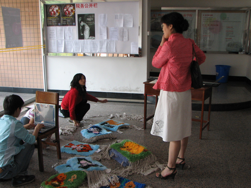 纺织工程05级吴娟、杨燕、张芳同学在义卖现场布展