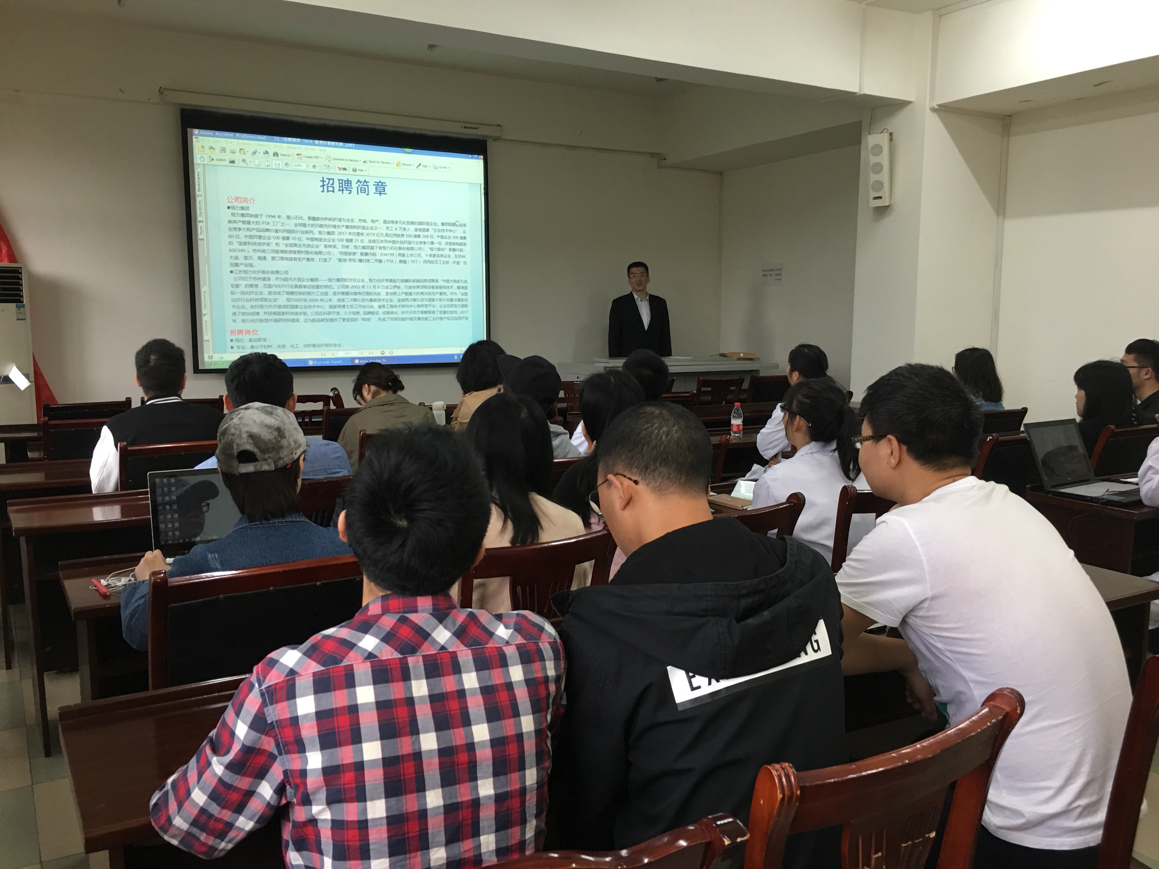 2018年4月13日上午,江苏恒力集团恒力研究院金管范副经理、新型纤维研究所王永锋副所长、江苏恒力化纤股份有限公司尹立新总经理助理一行到纺织与服装工程系进行交流。纺织与服装工程系对太阳成集团tyc33455cc、太阳成集团tyc33455cc及纺织与服装工程系的基本情况、人才培养、科学研究方向、就业等做了介绍,恒力集团对集团公司基本情况、研究院、研究所进行介绍,就双方的科研合作进行探讨。同时,新型纤维研究所王永锋副所长向本科生和研究生宣讲恒力集团、化纤股份有限公司基本情况、公司业绩、员工待遇、福利、公司文化等,并对本科生和研究生招聘岗位、福利待遇等进行说明。员工听了讲座后,对世界500强恒力集团进行了全面的了解,讲座后部分同学投递了简历。