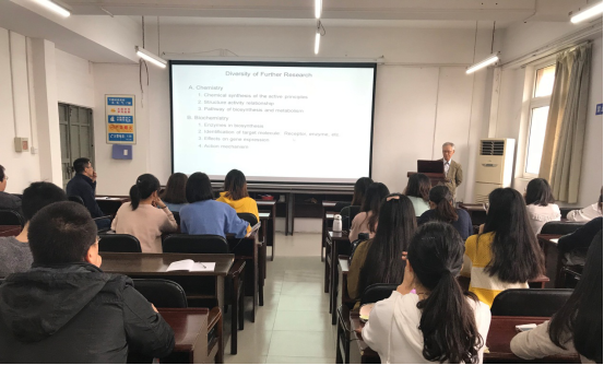 报告中,山口五十磨教授结合多年从事植物化学研究的科研经历及丰富实践,耐心细致地为大家介绍了通过微生物发酵方式高效获取天然产物的研究现状,畅谈了对该领域的真知灼见。报告深入浅出,充满了丰富的科学前沿知识,赢得师生们阵阵掌声。本次报告既使同学们对微生物发酵获取天然产物领域有了更深的了解,也给同学们展示了从事科研工作应具备求真、务实、严谨的科学态度。