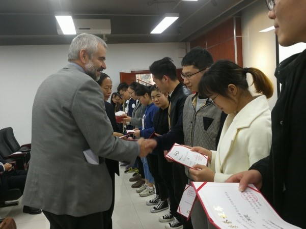何有节经理回顾了司马公司与皮革系的合作历史与取得的成绩,对张建华总经理为合作付出的努力表示感谢,并为张建华总经理颁发轻化工程“卓越工程师教育培养计划”企业导师聘书。