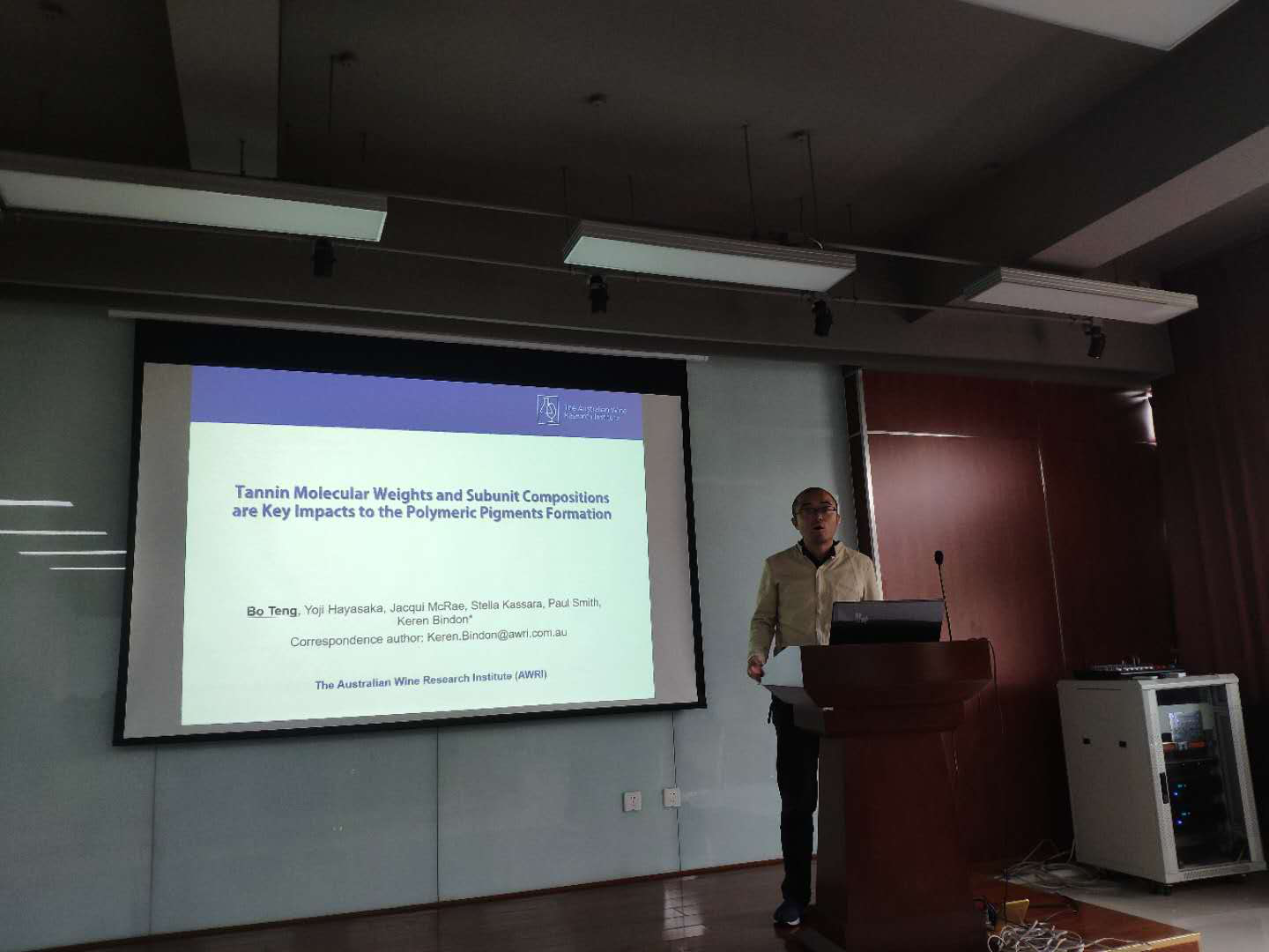本次讲座滕博副教授以单宁与花色苷反应对对葡萄酒颜色的影响为主要研究目的,采用从葡萄皮和葡萄籽中分离纯化得到的不同分子量大小的单宁,在各种模拟葡萄酒环境中考察了不同单宁与花色苷的反应动力学、产物组成和结构以及对酒品品质的影响。滕博副教授的报告涉及单宁的分离纯化以及组成和结构分析,进一步拓展了公司师生在植物单宁领域的研究思路和方法,引起了与会师生的浓厚兴趣。同时滕博副教授还就葡萄酒酿造、品鉴等内容进行了深入浅出的报告。
