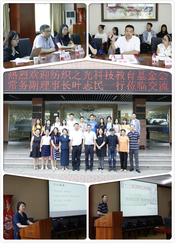 2019年6月12日,纺织之光教育科技基金会副理事长叶志民、中国纺织服装教育学会副秘书长白静、《中国纺织》杂志社新媒体部主任易芳赴公司对“纺织之光”中国纺织工业联合会教育奖项目进行回访考察。现场交流会在公司皮革楼会议室举行,公司肖凯副经理、系行政人员、近两年获奖师生等参会,由纺织与服装工程系主任郭荣辉主持。