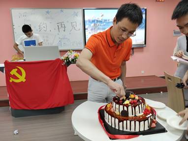 组织生活最后,为了庆祝大家顺利毕业和党支部的成长,党支部支委们为大家定制一个蛋糕,由冯国涛副书记为大家切蛋糕,党支部成员们一起吃蛋糕并相谈甚欢。