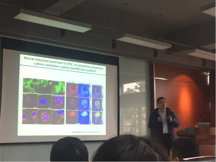 论坛于下午13:00顺利开讲。郭俊凌特聘教授主持并致欢迎辞,表达了对受邀专家、参会师生的衷心欢迎和感谢,并期盼未来能更多地举行类似的合作交流论坛。程冲特聘研究员首先作了先进低维功能材料、诱导型组织工程支架,在诱导神经细胞分化方面的研究成果及进展的报告分享;魏强特聘研究员系统性介绍了细胞粘附与力学信号转导的概念及研究进展,包括细胞外力及细胞内力在静态与动态条件下,对细胞遗传因子及细胞分化的调控;赵辉教授作了题为“EDC为染料的活性酯类高分子非平衡态自组装”的报告,介绍通过高分子可逆酯化,为实现周期性化学可逆反应提供了可能性;邓旭特聘教授作了题为“界面调控的研究及进展”的报告,介绍疏水疏油透明材料的开发,以及最新发表在Nature Materials的研究成果——“基于表面电荷打印的可控液滴传送”;最后郭俊凌特聘教授介绍了金属-多酚网络MPNs材料化学的理念,以及其先进材料的研究与工程应用,例如通过植物多酚的纳米薄膜的研究,实现胶体材料的模块化自组装成为各类超结构的研究。