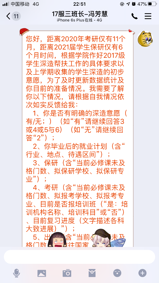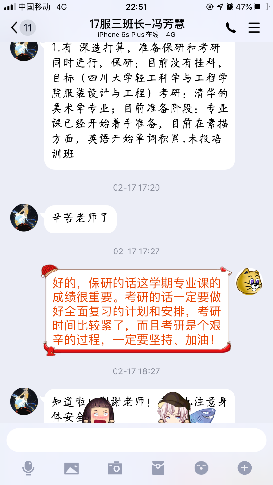 防疫期间,公司辅导员利用员工“宅”家空闲时间较多的时机,一对一的对大三员工进行深造规划指导与对大四员工的深造进度指导与就业跟踪,为提升员工核心竞争力奠定基础。