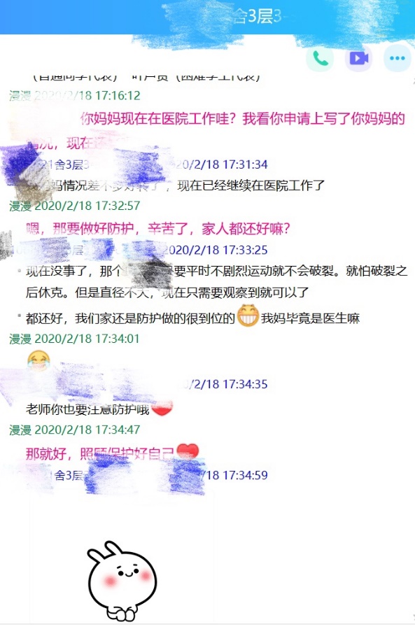 当疫情来临时,公司员工事务办公室全体老师立即启动全院员工的摸排工作,重点对武汉籍、湖北籍员工的家庭情况、健康状况进行了全面了解,并制定了“一对一”关爱帮扶行动方案。疫情期间,各年级辅导员对员工情况通过每日健康打卡进行了动态跟踪,并及时向员工传达了相关通知要求以及防疫知识、心理健康、学习指南等,让全体同学情绪稳定,理性对待疫情,以积极态度配合搜狗、当地政府工作,助力打赢疫情防控阻击战。