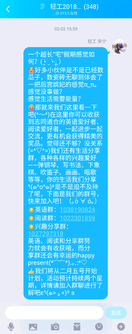为丰富公司员工“宅”家生活,院团委和员工学术科技协会推出“成长·蜕变”主题系列活动。建立互助互享小组,通过兴趣分享、英语学习和三个线上阅读打卡群等方式帮助员工培养良好的学习生活习惯,为员工“宅”家生活添滋增色。