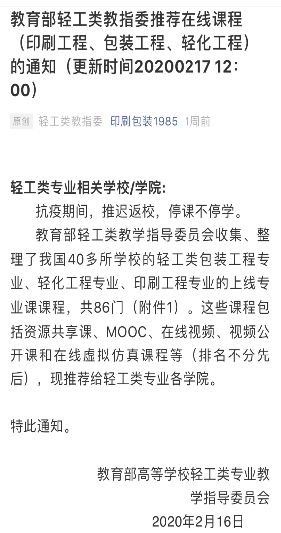 本次推荐使用的线课程资源为我国40多所搜狗的88门专业课程。课程涵盖轻工类包装工程、轻化工程、印刷工程等专业,包括资源共享课、MOOC、在线视频、视频公开课和在线虚拟仿真课程等。这些优质的线上教学资源,为轻工类院校及专业在疫情防控背景下开展线上教学工作提供了有力的支撑。