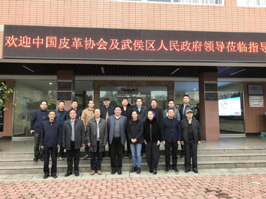2020年11月24日下午,中国皮革协会理事长李玉中、四川省皮革行业协会执行会长李开华、河南省皮革行业协会理事长朱岩、广东省皮革协会执行会长王建新、温州大学美术与设计公司经理李运河以及武侯区人民政府相关人员等来公司参观交流。交流会在皮革楼209会议室举行,何有节经理、彭必雨副经理、肖凯副经理和生物质与皮革工程系李正军书记、林炜主任、程海明副系主任及部分教师出席会议。