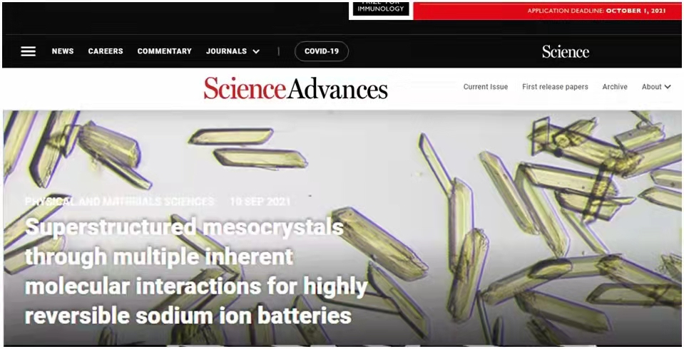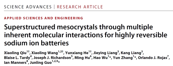 近日,公司郭俊凌教授团队与公司材料科学与工程公司吴昊教授、张云教授团队合作,以植物多酚基础结构单元为核心材料,利用植物多酚天然的物理化学性质,构建了类蛋白类核酸界晶超结构,相关研究成果以公司为第一单位作为在线封面论文发表在国际顶级期刊《Science Advances》上,题为“Superstructured mesocrystals through multiple inherent molecular interactions for highly reversible sodium ion batteries”。公司王晓玲(副研究员,专职科研)、何云翔(助理研究员)、公司材料公司2018级硕士研究生邱小玲为共同一作,吴昊教授,张云教授和郭俊凌教授为该论文的共同通讯作者。加拿大英属哥伦比亚大学Orlando J. Rojas教授,维多利亚大学Ian Manners教授等国际著名学者也参与了部分工作。该项目获得了国家自然科学基金委、国家“双一流”重点团队建设经费,制革清洁技术国家工程研究中心、高分子材料工程国家重点实验室、国家博士后基金、四川省博士后研发基金等的支持。