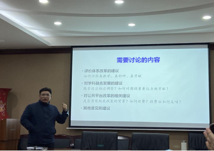随后,何有节经理从八个方面就公司“十四五”规划、双一流建设情况、高峰团队建设、第五轮学科评估进展、专业课程建设等与各系教师进行交流分享,直面问题和压力、提振教师士气。
