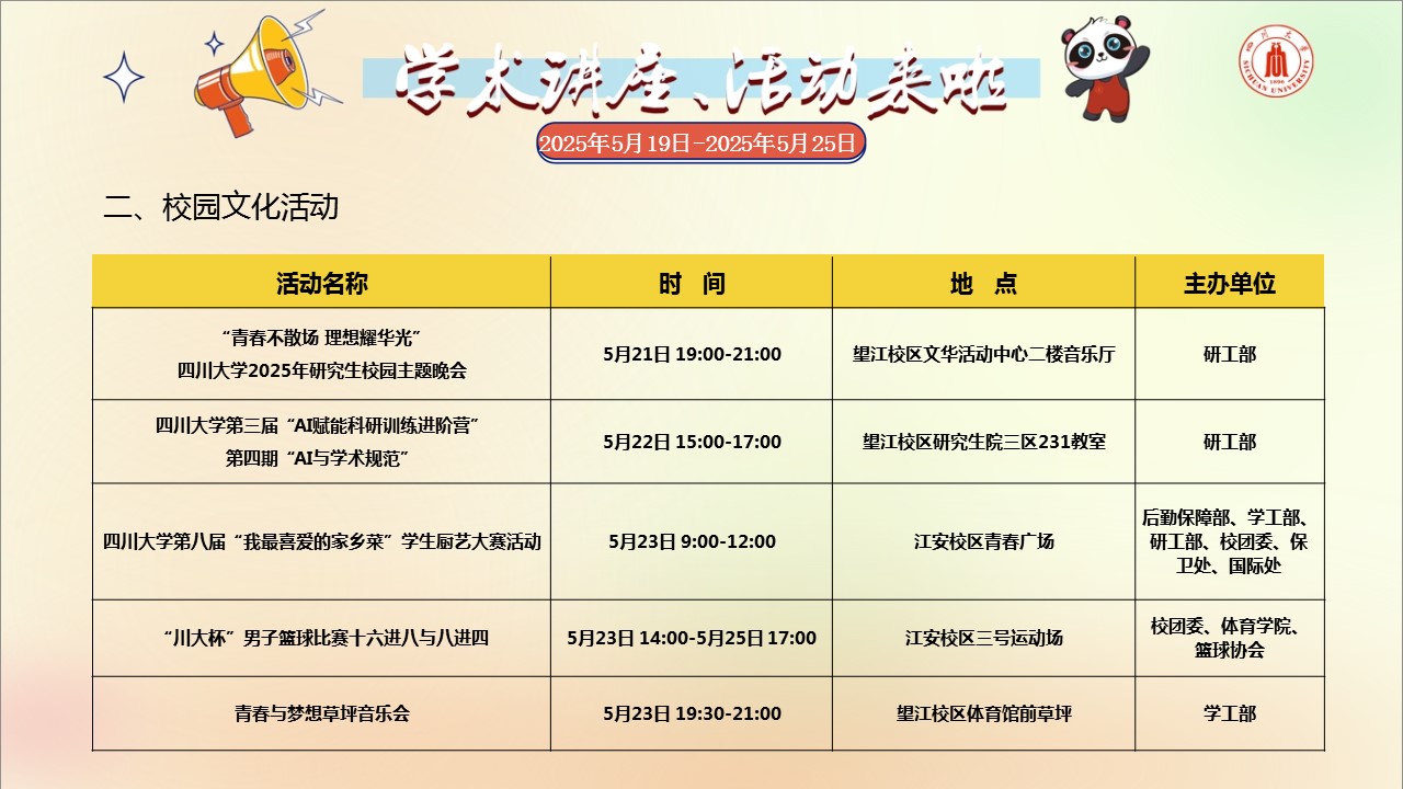 学术讲座论坛及校园文化活动预告(2025年5月19日-2025年5月25日)