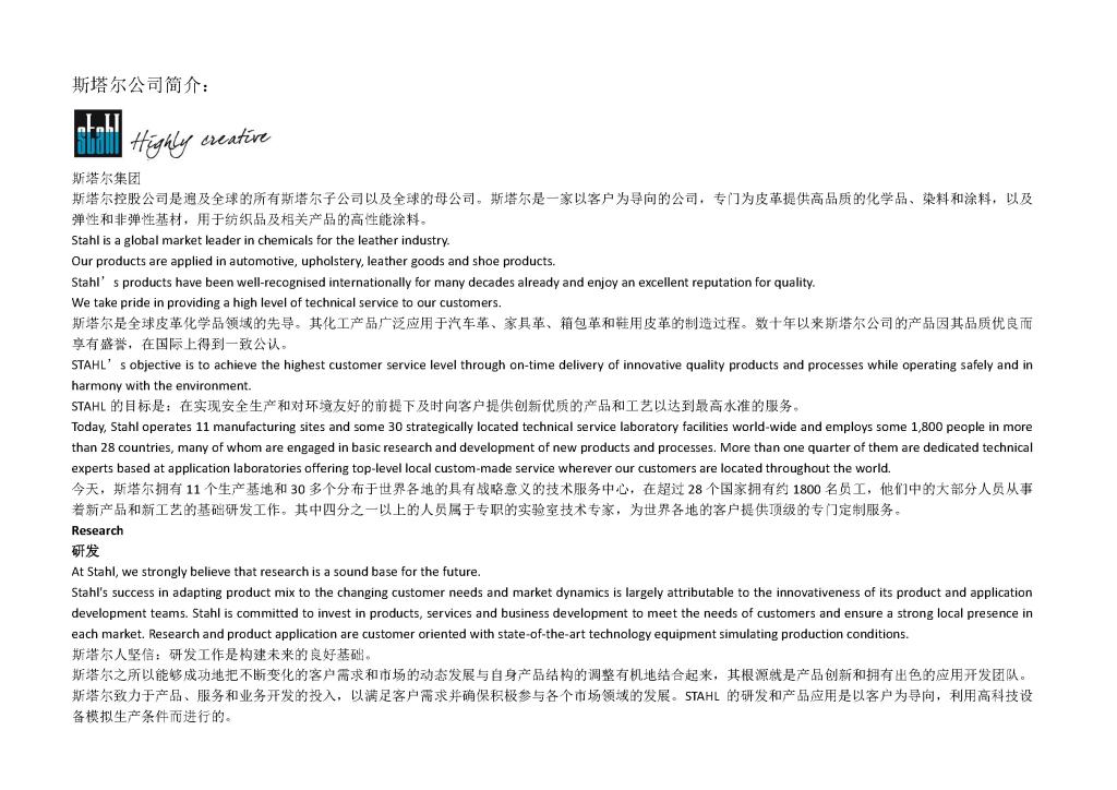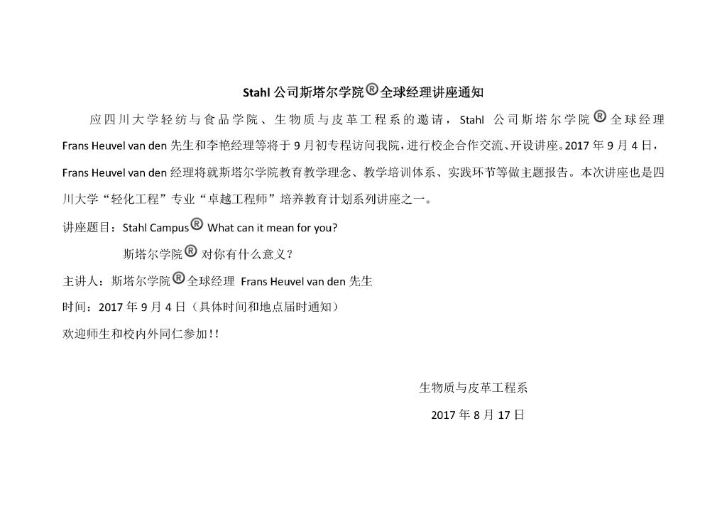 Stahl公司斯塔尔公司全球经理讲座通知