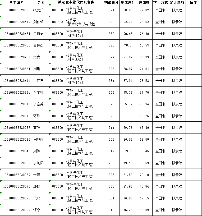 太阳成集团tyc33455cc/制革清洁技术国家工程实验室 2020年硕士研究生调剂拟录取名单公示