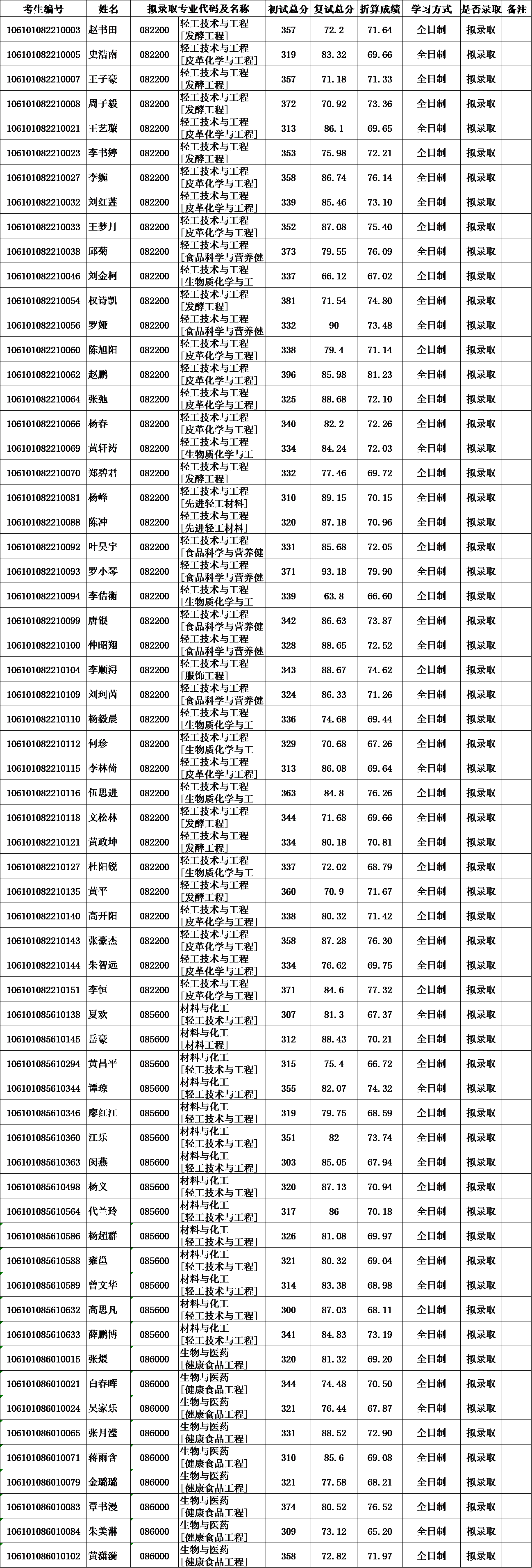 太阳成集团tyc33455cc/制革清洁技术国家工程实验室2021年硕士研究生拟录取名单公示
