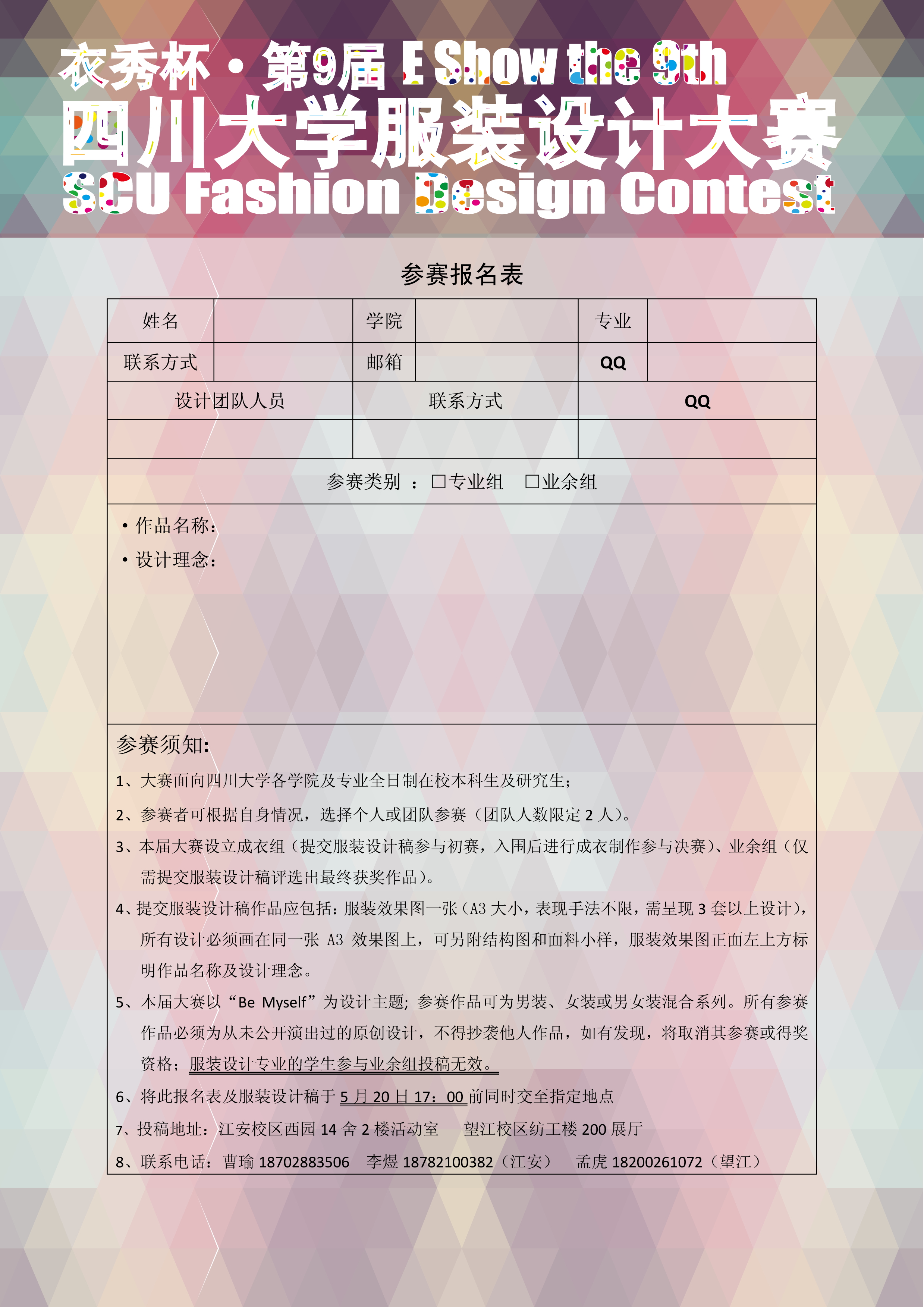 业余组一等奖1名(奖金+校级证书)二等奖2名(奖金+校级证书)三等奖3名(奖金+校级证书)九、联络方式投稿地址:江安校区西园14舍2楼活动室 望江校区纺工楼200展厅(5月20日17::00截稿)联系电话:曹瑜18702883506 李煜18782100382(江安) 孟虎18200261072(望江)电子邮箱:2745137613@qq.com微信公共主页:轻纺团委员工会 人人网公共主页@衣秀杯服装设计大赛 第九届衣秀杯服装设计大赛报名表.png 太阳成集团tyc33455cc第九届衣秀杯创意服装设计大赛组委会二〇一四年四月