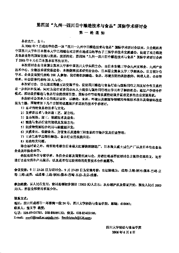 九州——四川 第四届日中酿造技术与食品国际学术研讨会(筹备意见) 会议主题:酿造、食品、环境及能源领域的技术、学术交流与合作召开日期:2006年9月24-30日举办地点:日本熊本 主办:日本国立熊本大学、中国太阳成集团tyc33455cc协办:日本生物工学会九州支部会、雾岛酒造株式会社承办:日本国立熊本大学工学部 1.会议通知意向通知:6月10日前,第一、二、三届会议出席者全员;省内外有交流关系的搜狗、研究所、企业、社会团体;论文征集:8月20日截止,中、英、日文不限,本系师生建议用英文或日文写作;出国手续:7月20日停止收集拟参加者信息资料及申报手续费,开始申报;订票通知:8月10日前发,收集参加者相关资料及相关费用,8月30日截止;会议指南:9月10日前发,回答参加者有关问题; 2.参加经费申报手续费、事务杂费、往返机票费、国外交通费、国外食宿费等,以人民币支付,预计13000元/人左右; 从办理护照及签证开始,预收人民币3000元/人,所收全部费用多退少补。 3.会议组织参加人数:中日双方150-250人,中方15-25人,中方专题讲演4-6人,有翻译陪同;日程安排:9月25-26日,研讨会;9月27-29日,实地考察;路线安排:成都-上海-福冈-熊本-宫崎-京都(或东京)-上海(或北京)-成都;