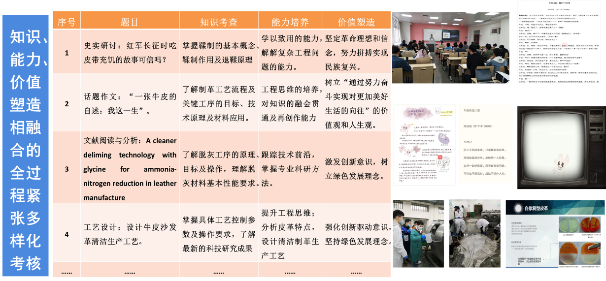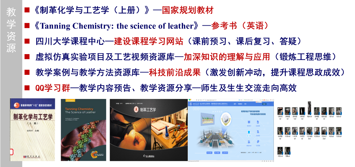 开展课程教学内容的系统重构。将科技前沿成果融入课程。针对知识更新滞后的问题,建设以行业科技发展的新理论、新技术为主的教学案例库,提升教学内容的前沿性和时代性。积极利用现代信息手段丰富课程教学资源,先后建成了《制革工艺学》线上课程平台;《制革脱毛生产实训及脱毛效果可视化监测虚拟仿真实验项目》;可视化制革工艺教学视频库等。经过多年的发展,已经建成了以国家规划教材为基础的、虚实结合、线上线下融合的教学资源体系;为丰富教学方法奠定了基础,并为提高员工对工程认知提供了工具。