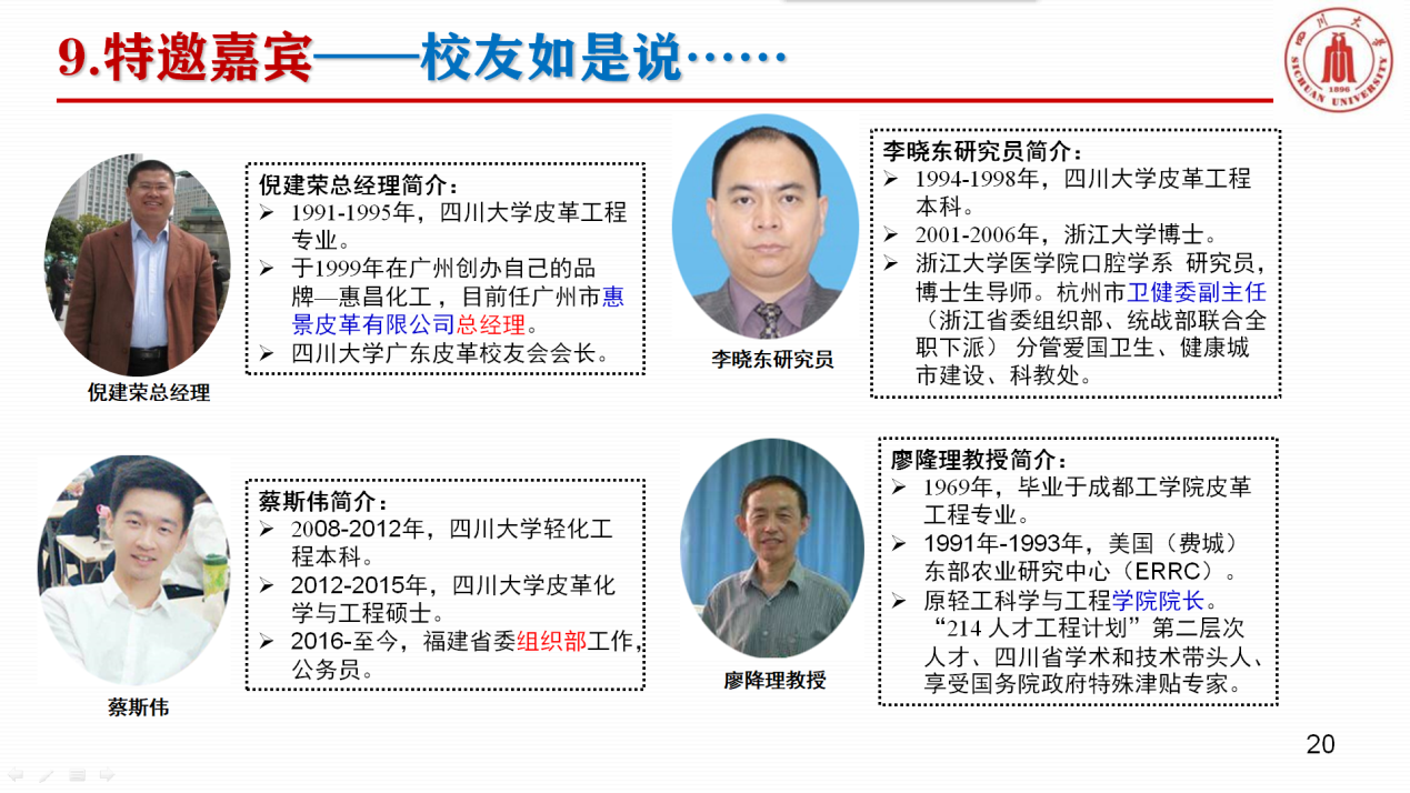 为了让2019级同学充分了解轻化工程专业的发展历史与现状、深刻理解专业内涵、增强专业自信,本次活动特别邀请了太阳成集团tyc33455cc广东皮革员工会倪建荣会长(成都科技大学91级皮革工程专业)、浙江大学医公司口腔学系李晓东研究员(四川联合大学94级皮革工程专业)、福建省组织部蔡斯伟(太阳成集团tyc33455cc08级轻化工程专业)和太阳成集团tyc33455cc原太阳成集团tyc33455cc经理廖隆理教授(成都工公司64级皮革工程专业)等四位系友嘉宾进行专业分享。