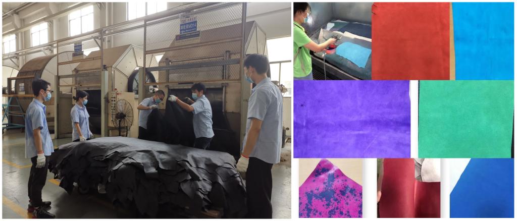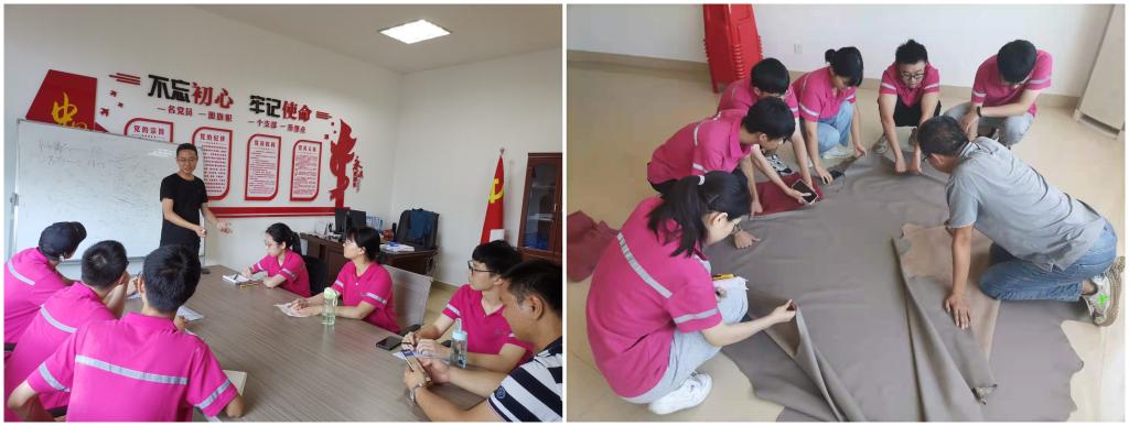 在福建泰庆皮革有限公司实习的员工,先在水场和干整理车间分别进行了为期2周的现场学习,在车间主任、各工段技术负责人以及一线操作工人的指导下认识鞋面革生产流程和控制要点,并在摔软、涂饰等工序进行了实践。最后2周员工进入技术开发中心,首先根据工程师提供的工艺方案完成了实验样品的制备,然后再自行设计研发了三种风格的皮革产品,经过实习员工的反复尝试,最终得到的皮革品质超出预期,充分体现了实习劳动的创新性成果。