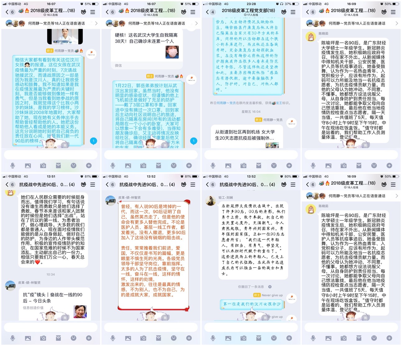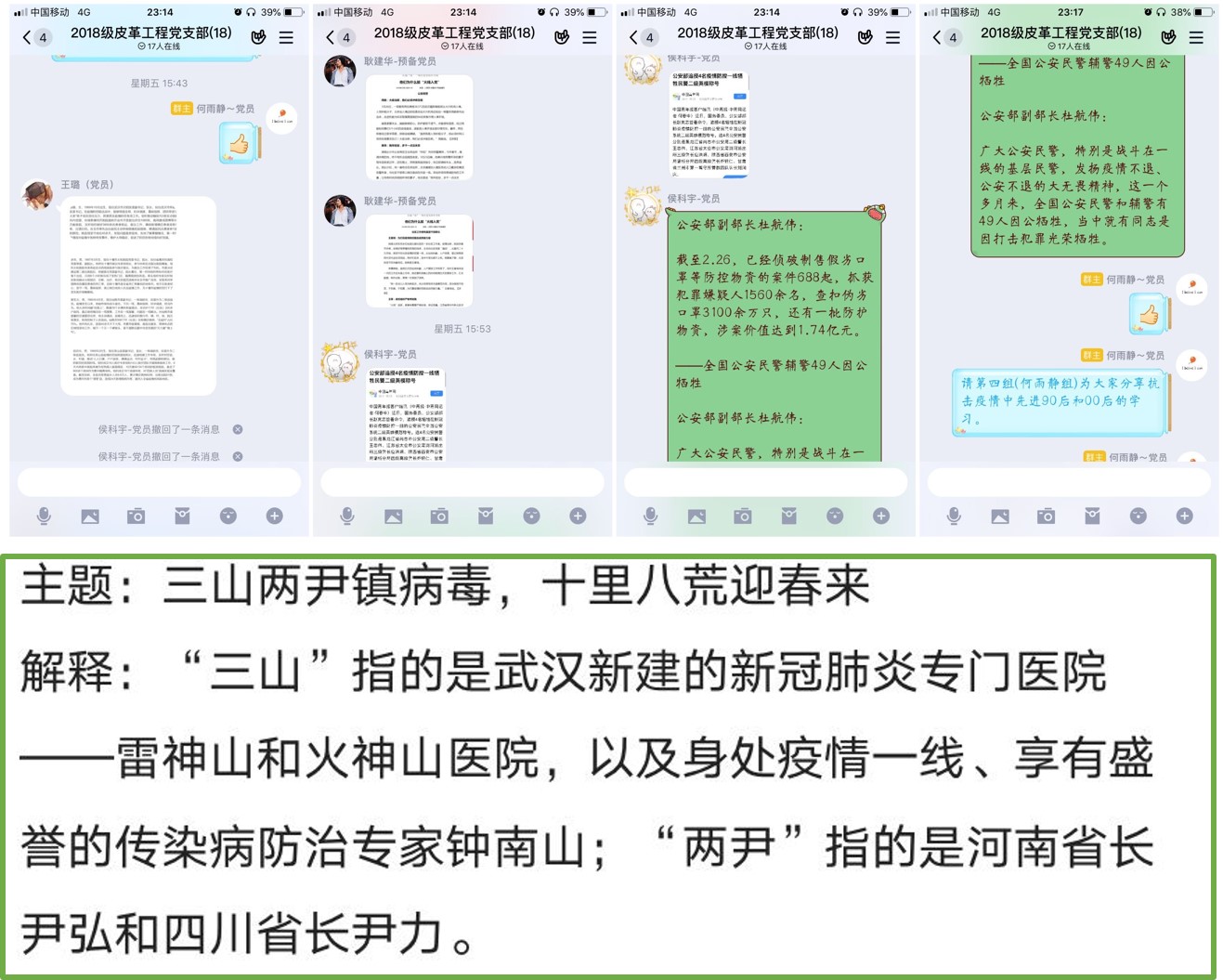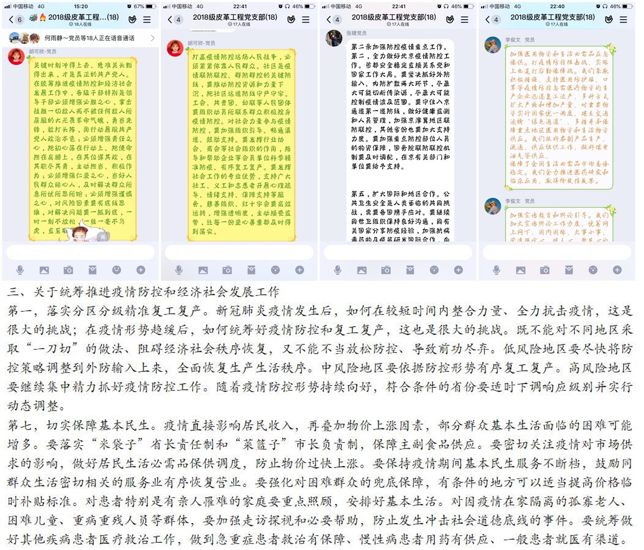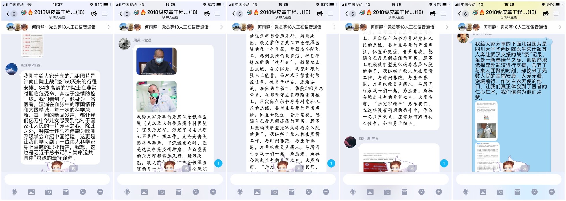 2020年3月13日下午三点,2018级皮革硕士研究生党支部结合习近平总书记在疫情期间的讲话精神和奔赴前线的先锋模范代表事迹,召开了“同心抗疫,‘疫’路学习”云上主题党日活动,会议由支部书记何雨静同志主持,全体党员通过线上语音和文字交流方式参加。