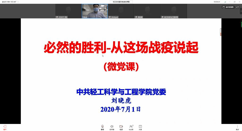 为全面贯彻落实党中央和校院关于常态化疫情防控的决策部署,充分发挥公司各党支部的战斗堡垒作用和师生党员的先锋模范作用,让党旗始终高高飘扬在疫情防控、返校复学、事业发展的全过程,值此纪念建党99周年之际,按照教育部和公司党委关于认真组织开展“四个一”行动的的相关要求,7月1日下午,公司党委书记刘晓虎同志在纺工附楼204会议室讲授了一堂题为《必然的胜利—从这场战疫说起》的专题微党课。微党课采取线上线下相结合的方式进行,公司经理、党委副书记、科级干部在现场参会,其他党委委员、教职工党支部书记在线上参会。