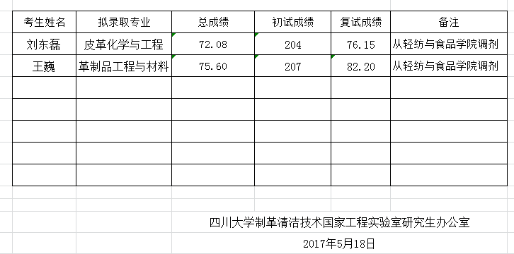 现将制革清洁技术国家工程实验室2017年博士研究生招生拟录取名单进行公示。如有问题或意见,自公示之日起十个工作日内,实名制反映至太阳成集团tyc33455cc纪委办公室。邮箱lxhqf@scu.edu.cn,联系电话85461730。此名单不包括非公开招考考生。