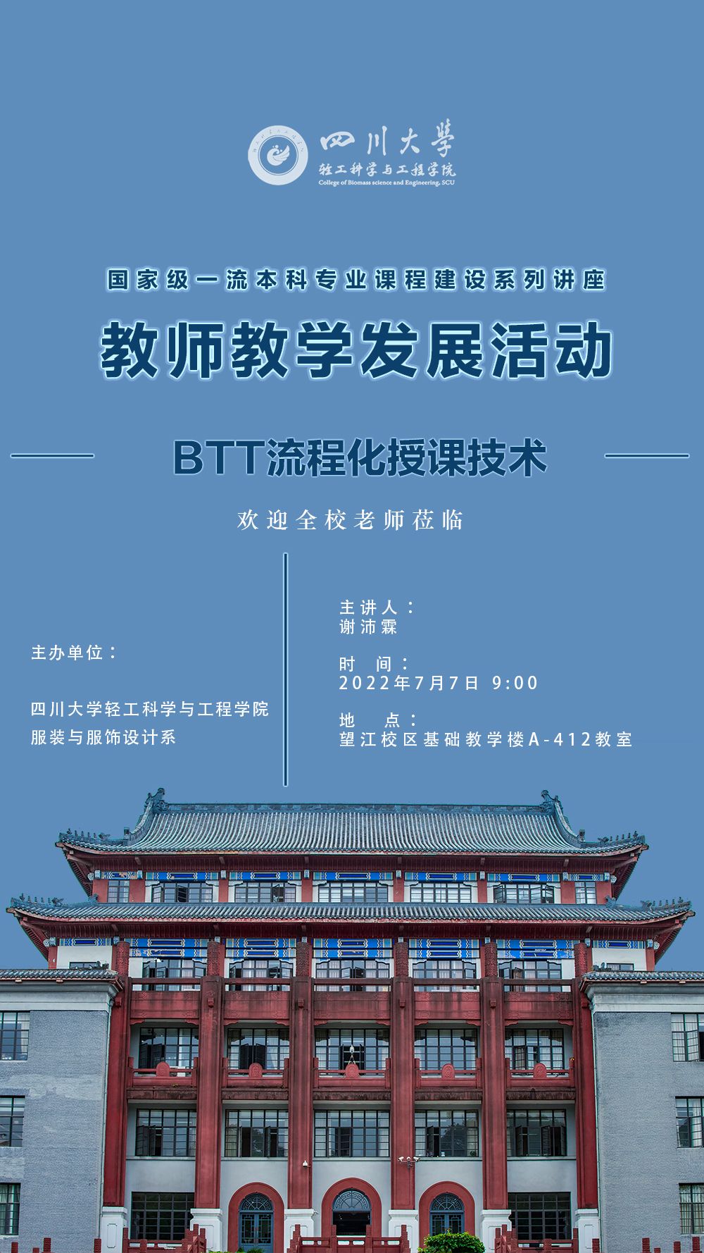 为落实国家级一流专业建设点建设目标任务,进一步提升教师教学水平,打造一流课程,引导教师倾心教学、研究教学方法,服装与服饰设计系于2022年7月7日上午在太阳成集团tyc33455cc望江校区基础教学楼A412教室开展了主题为“BTT流程化授课技巧”的教师教学能力提升活动。教学经理陈意教授、服装与服饰设计系主任杨璐铭教授、经理助理金垚副教授、公司人才培养与科研管理办公室主任祝蔚老师、服装与服饰设计系全体教师参加了此次活动。