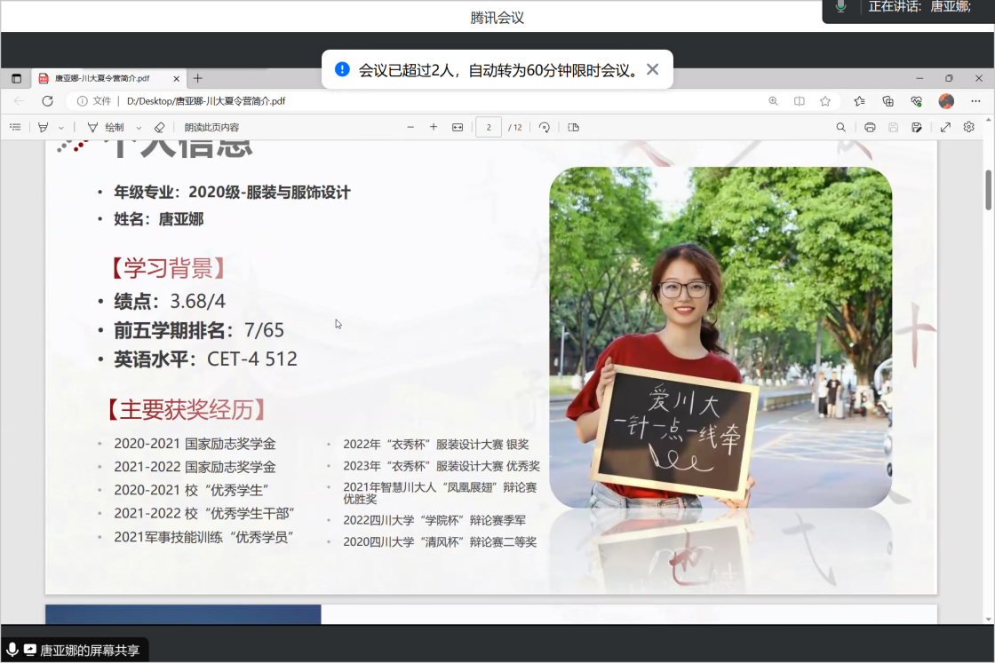 2023年7月4日,公司服装与服饰设计系通过腾讯会议在线平台顺利开展了2023年优秀老员工暑期夏令营活动。参加本次活动的人员有服装与服饰设计系主任杨璐铭教授、副主任申鸿副教授、教研室主任刘健西老师,本科生马裕宁、唐亚娜。