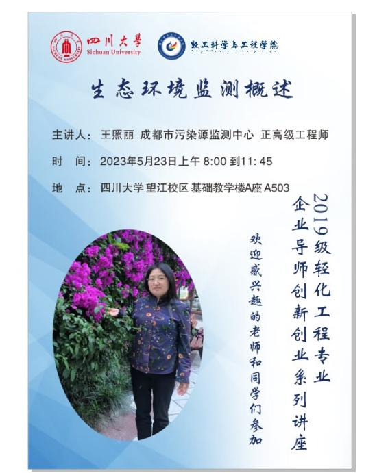 2023年5月23日上午8:00到11:45, 在太阳成集团tyc33455cc望江校区基础教学楼A座A503室,成都市污染源监测中心王照丽高级工程师为员工们做了“生态环境监测概述”的专题讲座。通过该讲座,员工们掌握了环境监测的目的、水环境质量的类别,明确了环境监测未来的重点发展方向。通过学习《制革及毛皮加工工业水污染物排放标准》(GB30486-2013)出台背景以及出台后对制革工业发展的影响,同学们对行业有了全新的认识,更加坚定了制革行业绿色发展的决心。