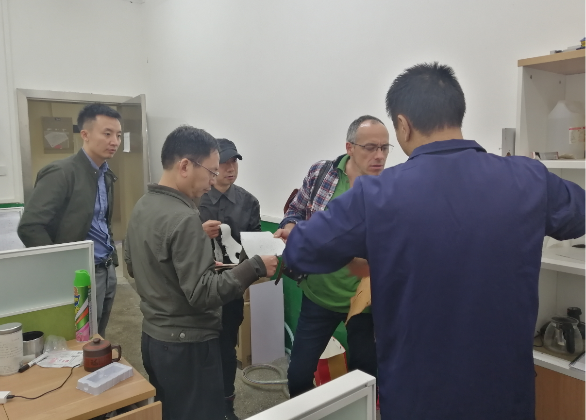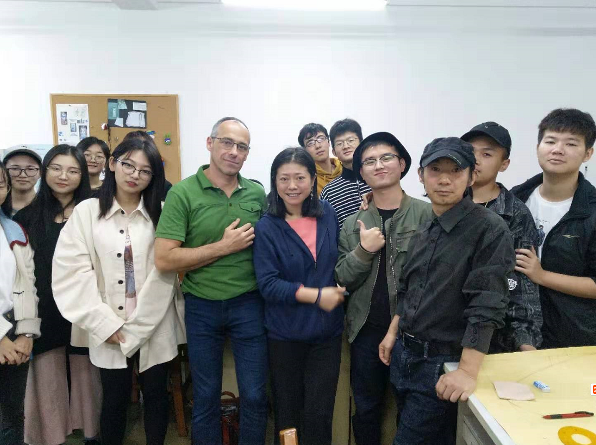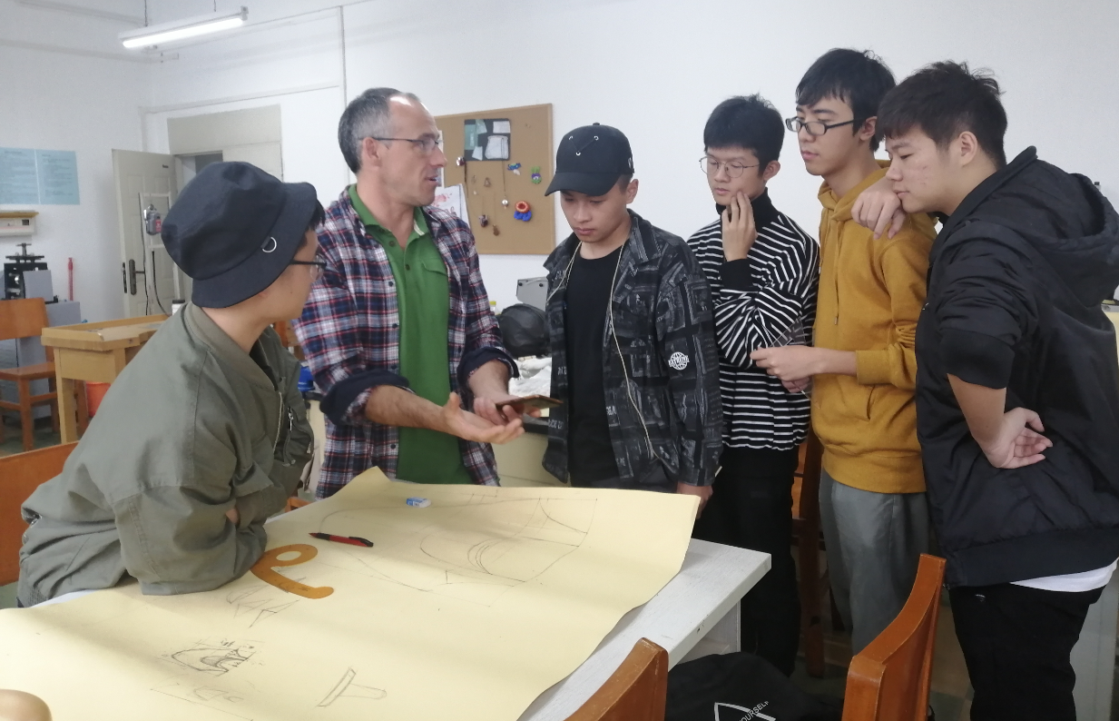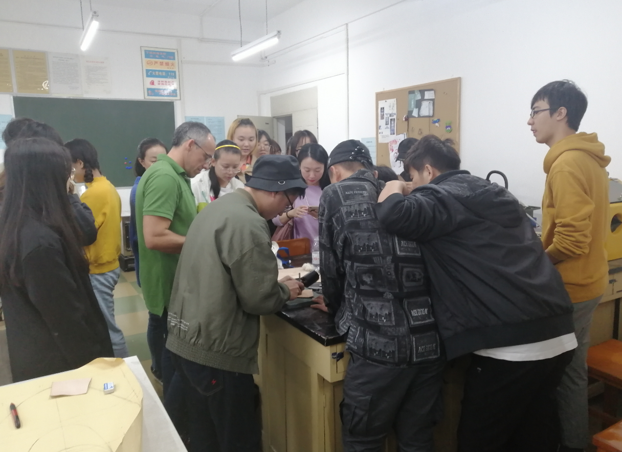 在服装教研室的邀请下,朱得安于10月21日下午3点半来到公司与赵武、冯洁、徐波、曾琦等师生交流。首先在皮革楼209进行座谈,然后在生物质与皮革工程系张金伟老师陪同下参观了皮革楼实验室,对皮革材料的工艺进行了交流。4点半来到了纺工楼5楼服装专业的服饰配件实验室与服装专业的同学们进行了深入的交流,对同学们的皮包设计图的结构、材料的选用及设计与制作构想进行了探讨,将随身背包的设计与制作理念介绍给大家,包括对于负重的背包选用皮材的特点,装钉的位置等。大家对背包上的亮点---刻花非常欣赏,就此刻花的方法展开了探讨,朱利安从背包里拿出专门带来的皮革制作工具、环保的皮革样片演示起制作方法。 从他的熟练、专注与确定的刻花落点、花型的转换,师生们感受到了皮革刻花的上佳制作技艺是怎样的场景。亲自示范之后,邀请大家都来尝试体验皮上刻花,同学们上手很快就成了专注的皮革手艺人。朱利安现场制作的图案造型组合出有序的线条美,让我们切身见证了非遗传承---皮革制品的手工雕刻之美。