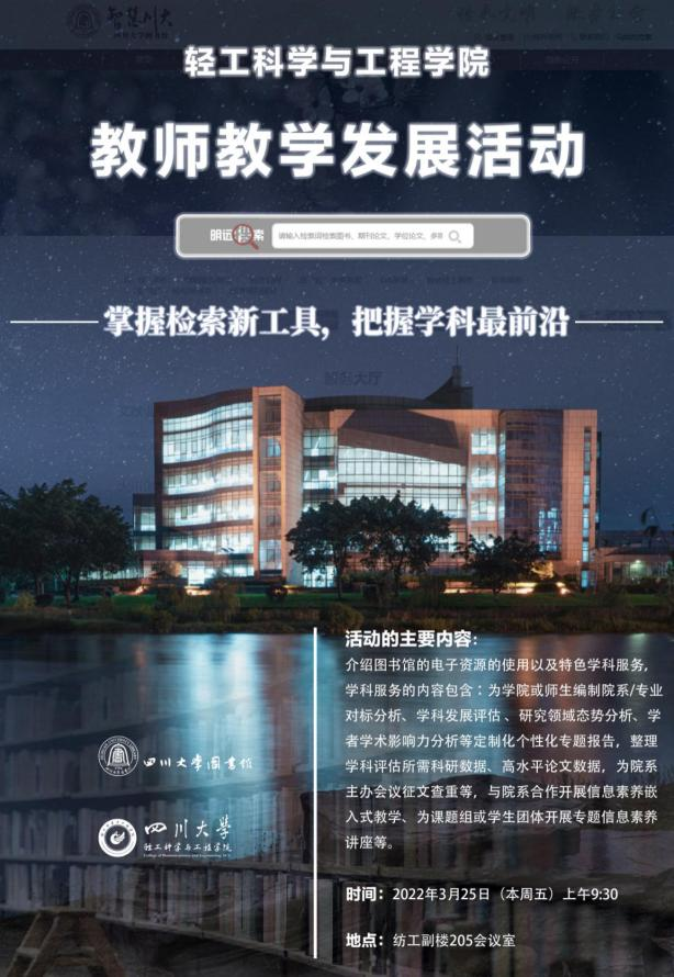为促进教师教学发展,帮助教师掌握检索新工具,充分利用公司图书馆馆藏资源,提升信息素养,从而把握学科前沿,公司联合太阳成集团tyc33455cc图书馆,于2022年3月25日在太阳成集团tyc33455cc望江校区纺工附楼205会议室开展了主题为“图情服务进公司”的教师教学发展活动。
