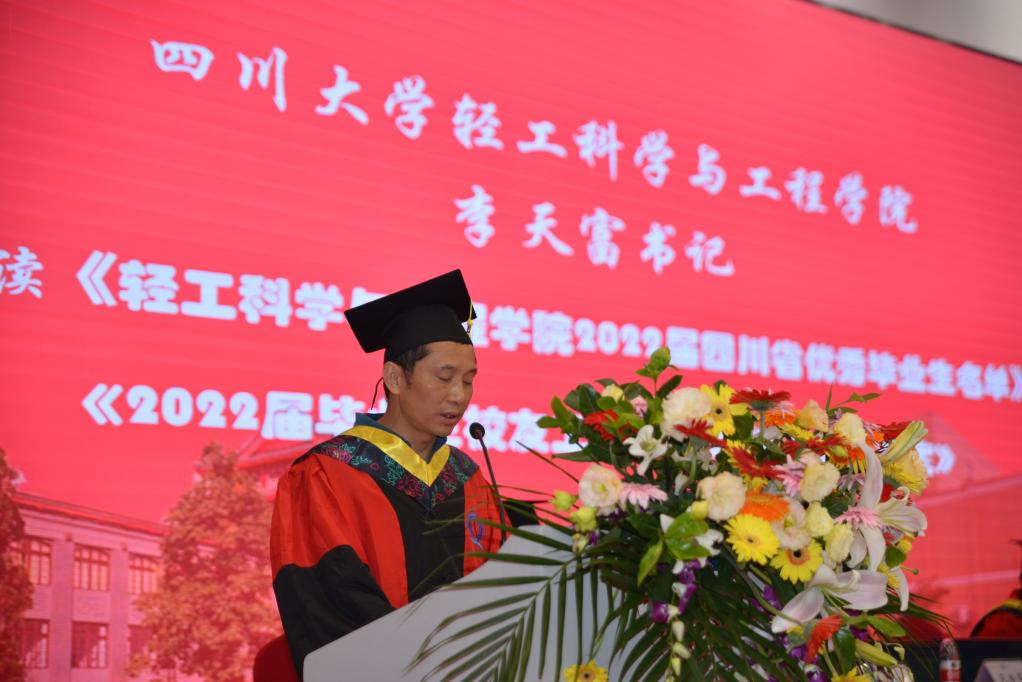 毕业暨授位典礼在庄严的国歌声中正式开始。首先,彭必雨经理代表公司党政致辞。彭经理向2022届圆满完成学业,获得学士、硕士、博士学位的同学们表示最热烈的祝贺!向前来参加毕业典礼的各位领导、导师代表、家长代表表示衷心的感谢!彭经理同与会人员一起回顾了公司近年来在团队建设、人才培养、科学研究等方面取得成绩。彭经理指出,这些成绩的取得离不开公司全体教师的集体智慧与辛勤工作,离不开公司全体同学的积极配合与全面参与,公司学科与专业的良好发展也定将是提升毕业生学历价值与社会认同的重要载体。过去的成绩永远属于我们每一位轻工人,未来的发展仍需全院师生和轻工员工们的鼎力支持。同时,彭经理向毕业生提出三点希望。第一、志存高远、不忘初心,做一个目标明确与意志坚定的人,坚定的朝着自己的生涯目标迈进。第二、脚踏实地、砥砺奋斗,做一个勤奋务实与追求卓越的人,用最美的奋斗去创造属于你的最美人生。第三、增强本领、服务行业,做一个常怀感恩与回报社会的人。希望同学们在奋斗中成就自我、回报社会,真正成为新时代的主人,在新的人生征程中创造出无愧于时代的辉煌业绩。