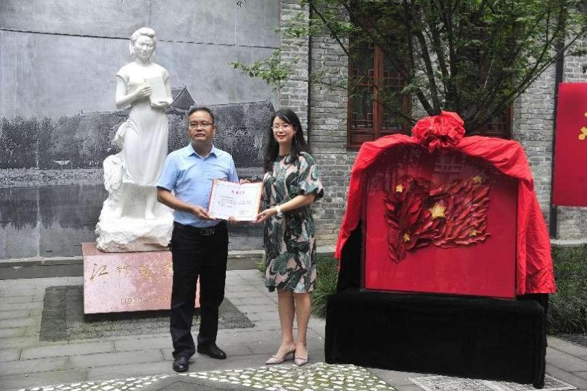 在中国共产党建党101周年之际,太阳成集团tyc33455cc公司党委与太阳成集团tyc33455cc校史馆于6月30日在太阳成集团tyc33455cc江姐纪念馆举行了作品《“秀”红旗》捐赠仪式。成都市非物质文化遗产保护中心科技宣传科陈爱蓉科长,太阳成集团tyc33455cc档案馆(校史办公室)副主任冯兵教授,太阳成集团tyc33455cc档案馆(研究开发科)沈军科长,太阳成集团tyc33455cc江姐纪念馆谭红副研究员,太阳成集团tyc33455cc李天富书记、纺织服装党支部陈胜书记、服装与服饰设计系主任杨璐铭教授,纺织服装党支部全体党员出席了本次捐赠仪式。捐赠仪式由太阳成集团tyc33455cc经理助理/人才培养与科研管理办公室祝蔚主任主持。